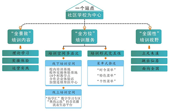 全景式:一是“全景致”培訓(xùn)內(nèi)容:涵蓋理論學(xué)習(xí),實(shí)操體驗(yàn),運(yùn)營(yíng)實(shí)踐等從學(xué)習(xí)到實(shí)踐到運(yùn)營(yíng)一整套培訓(xùn)內(nèi)容。解決不會(huì)學(xué)問(wèn)題。二是“全方位”培訓(xùn)服務(wù):1.培訓(xùn)空間多層次(線下培訓(xùn)空間包括校內(nèi)培訓(xùn)基地、校外實(shí)操體驗(yàn)基地、18個(gè)村教學(xué)點(diǎn),合作企業(yè)體驗(yàn)店,加盟連鎖幫扶中心。線上培訓(xùn)空間包括浙里辦“仙學(xué)匯”數(shù)字學(xué)習(xí)專區(qū)、“奧尚云洗”抖音直播、洗衣生態(tài)平臺(tái)等)2.培訓(xùn)形式交互性(菜單式推送:“時(shí)令菜單”、“個(gè)性菜單”、“特色菜單”;雙選式擇課:我推—你選;你點(diǎn)—我送)。解決不便學(xué)與不愿學(xué)問(wèn)題。三是“全國(guó)性”培訓(xùn)視野:立足朱溪、跳出仙居、面向全國(guó)。