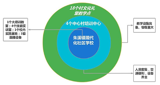 朱溪鎮(zhèn)洗衣共富課堂培訓(xùn)工程實(shí)施得到朱溪鎮(zhèn)政府的全力支持,每年撥出30萬(wàn)元經(jīng)費(fèi)支持培訓(xùn)工程運(yùn)作。在鎮(zhèn)政府的牽引下,社區(qū)學(xué)校開設(shè)18個(gè)村文化禮堂作為教學(xué)點(diǎn),根據(jù)社區(qū)教育培訓(xùn)需求,對(duì)全鎮(zhèn)相關(guān)教育資源進(jìn)行優(yōu)化整合,在對(duì)不同來(lái)源、不同層次、不同內(nèi)容的資源進(jìn)行選擇的基礎(chǔ)上,充分發(fā)揮這些資源的場(chǎng)地、設(shè)施、人員、技術(shù)等要素的優(yōu)勢(shì),把朱溪鎮(zhèn)的各種教育資源有機(jī)整合到洗衣培訓(xùn)的“點(diǎn)”上,高效、集約地發(fā)揮各個(gè)資源體的效用,構(gòu)建出一個(gè)有利于朱溪鎮(zhèn)成人教育培訓(xùn)發(fā)展的資源系統(tǒng)。朱溪鎮(zhèn)社區(qū)培訓(xùn)“資源圈”,是由朱溪鎮(zhèn)社區(qū)學(xué)校、4個(gè)中心村培訓(xùn)中心、18個(gè)農(nóng)村文化禮堂教學(xué)點(diǎn)三級(jí)網(wǎng)絡(luò)的三個(gè)同心圓組成的一個(gè)大“資源圈”,使朱溪鎮(zhèn)社區(qū)教育培訓(xùn)資源整體結(jié)構(gòu)最優(yōu)化和整體效益最大化,各培訓(xùn)要素邊際收益達(dá)到最優(yōu)。