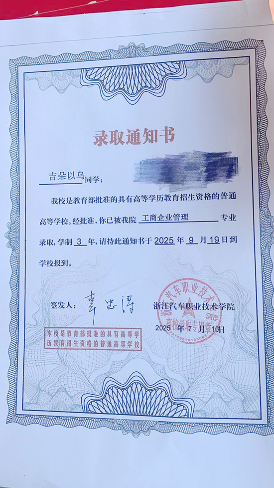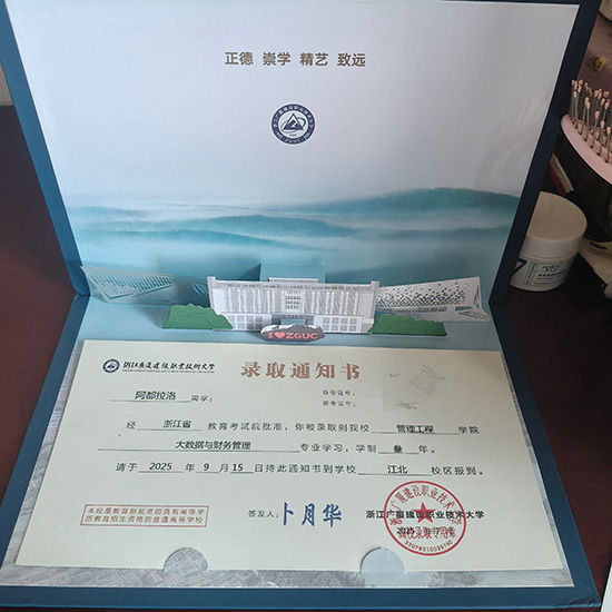 與吉朵以烏一同圓夢大學(xué)的,還有會計(jì)專業(yè)的阿都拉洛——這位彝族姑娘順利被浙江廣廈建設(shè)職業(yè)技術(shù)大學(xué)大數(shù)據(jù)與財(cái)務(wù)管理專業(yè)錄取。“考前的焦慮,考后的緊張,出成績前的忐忑不安,現(xiàn)在終于拿到了錄取通知書,這就是努力付出最好的回報。在大學(xué)期間我想繼續(xù)好好學(xué)習(xí),努力考證。”拉洛在給母校的留言中深情地說到,“感謝寧波給了我看世界的窗口,更給了我改變命運(yùn)的鑰匙。也非常感謝一直以來幫助關(guān)心我的老師和叔叔阿姨們。未來我還想留在北侖工作,用專業(yè)知識回報這座溫暖的城市。”