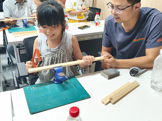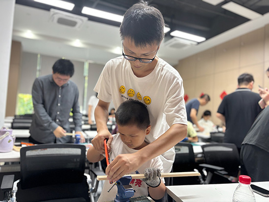 精準聚焦父職教育,方能破解親子陪伴難題。活動籌備階段,東信社區婦聯便敏銳捕捉到社區家庭教育中“父親缺位”這一普遍痛點。“不少媽媽跟我們反映,爸爸們其實想參與孩子的成長,卻總苦于沒合適的渠道。”社區婦聯主席姚晨霞道出活動設計的初衷,“所以我們特意設置了木工與射箭環節,就是想契合父親動手能力強、偏愛競技的特點,讓他們在協作中自然與孩子建立深度聯結。”從挑選木料、細細打磨到安裝弓弦,父親們寬厚的手掌包裹著孩子的小手,一同感受木料的細膩紋理與工具的暖暖溫度。木藝師傅也不禁贊嘆:“婦聯這主意真妙!木弓的張力得靠平衡,父子間的默契不也在這一推一拉里慢慢磨合出來了嘛。”