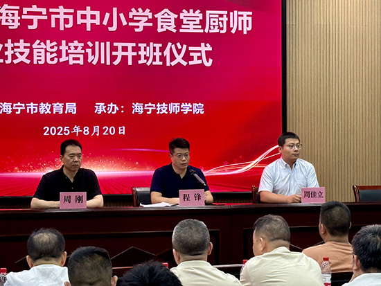 在開班儀式上,海寧技師學院副校長周剛、程鋒,現(xiàn)代服務學院院長錢葉萍、副院長周佳立等共同出席。程鋒副校長在致辭中強調(diào),校園食堂不僅關(guān)系到廣大師生的身體健康,更是教育事業(yè)穩(wěn)定發(fā)展的重要支撐。參訓學員應始終將食品安全置于首位,珍惜這次難得的學習機會。不僅要認真聽、認真看,更要積極思考、主動交流,將五星級酒店主廚和專業(yè)院校講師帶來的新理念、新技術(shù)真正轉(zhuǎn)化為自身的能力。他同時要求全體學員嚴格遵守培訓紀律,確保學習過程安全有序。周佳立副院長進一步明確整個培訓的流程,將以“理論結(jié)合實踐、突出實操實效”為根本原則,圍繞“廚房食品安全與食物中毒預防”“現(xiàn)代營養(yǎng)學基礎與學生餐搭配原則”“批量菜品標準化生產(chǎn)與控制”“冷菜與鹵味的制作安全”“特色面點與營養(yǎng)點心開發(fā)”以及“節(jié)氣食療與健康套餐設計”等核心模塊展開。他希望學員們通過系統(tǒng)學習,不僅能扎實掌握食品安全的關(guān)鍵控制點,更能提升在營養(yǎng)搭配、菜品創(chuàng)新與精細化生產(chǎn)方面的綜合能力,最終更好地服務于海寧市中小學的餐飲保障工作。