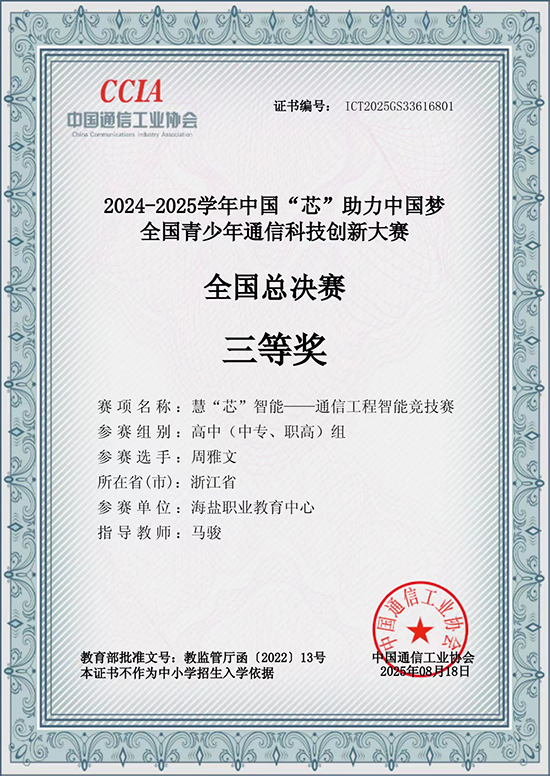 近日,2024—2025學年中國“芯”助力中國夢全國青少年通信科技創新大賽總決賽在遼寧大連落下帷幕。海鹽職業教育中心胡紹鴻、周雅文兩位同學,憑借扎實的專業功底和出色的賽場發揮,在“通信工程智能競技賽——無人機通信應急偵察賽”中脫穎而出,雙雙榮獲全國三等獎!