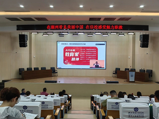 8月26日,全體教職工在學(xué)校報(bào)告廳觀看了湖州市教育局組織的2025年市屬學(xué)校(單位)教師暑期師德專題教育集中學(xué)習(xí)視頻直播。會(huì)議由市委教育工委專職副書(shū)記胡衛(wèi)東主持。湖州市教育局黨委書(shū)記、局長(zhǎng)黃建豐以《涵養(yǎng)教育家精神,打造專業(yè)化高素質(zhì)教師隊(duì)伍》為題作動(dòng)員講話,從傳道、授業(yè)、鉆術(shù)、爭(zhēng)譽(yù)和自律五維度闡述相關(guān)指引并強(qiáng)調(diào)教育家精神的融入與落實(shí);隨后,南通市海門(mén)實(shí)驗(yàn)學(xué)校張馗、浙江省教師教育質(zhì)量監(jiān)控中心徐建華分別作專題報(bào)告與講座,分享班級(jí)管理方法、解讀教育家精神等;湖州藝術(shù)與設(shè)計(jì)學(xué)校王樓天天也結(jié)合自身班主任經(jīng)驗(yàn),以幽默語(yǔ)言分享育人智慧,為我們提供了切實(shí)指導(dǎo)。