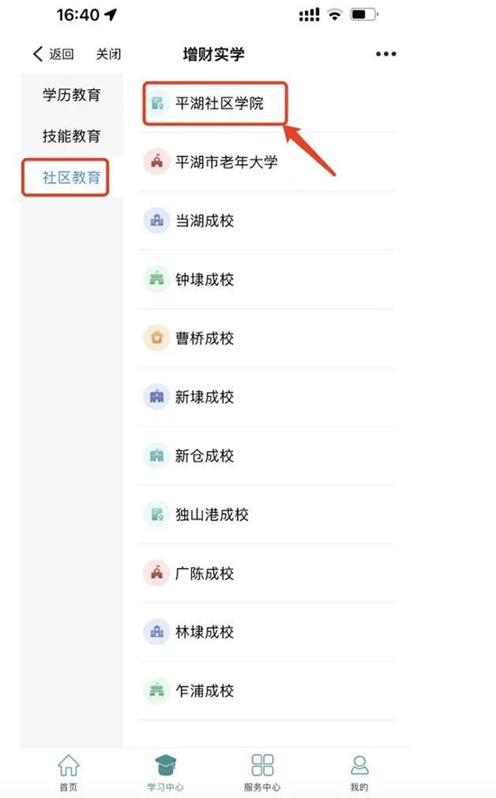 3、進(jìn)入平臺學(xué)習(xí)中心,并選擇“平湖社區(qū)學(xué)院”及對應(yīng)的課程