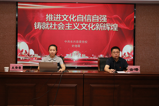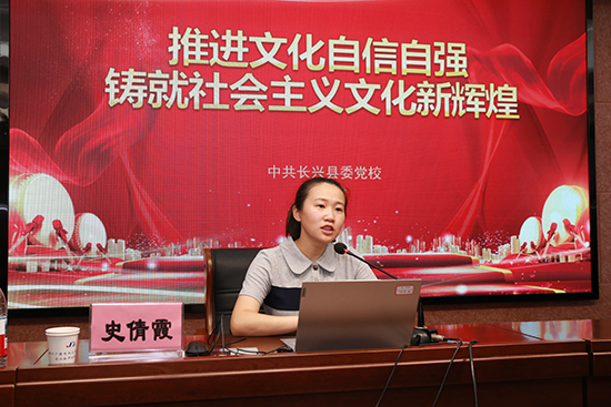 8月29日,長興開大教師進修學院黨總支組織開展8月份主題黨日活動,特邀中共長興縣委黨校史倩霞老師作專題黨課輔導,主題為《推進文化自信自強,鑄就社會主義文化新輝煌》。學院全體黨員參加學習。