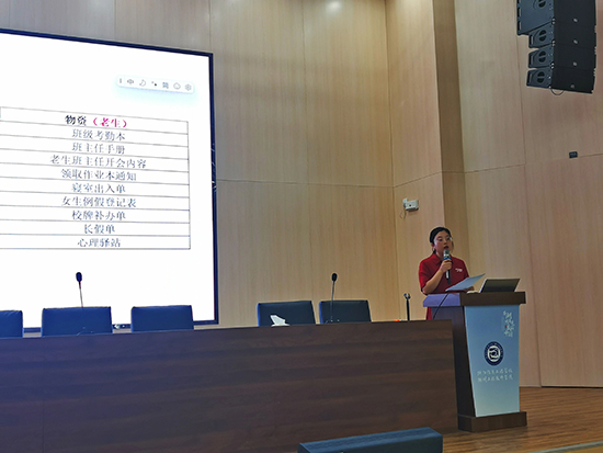 學生處處長楊育萍就開學新生報到流程、物資領取發放、軍訓事項安排等做詳細解讀,同時布置了新學期開學的主要工作任務,強調了班主任工作的重要性,從開學報到、家訪安排、儀容儀表、宿舍管理、校園安全等方面對班主任提出具體要求,要求班主任樹立信心,打開思路,明確方向,豐富德育途徑,創新工作方法。