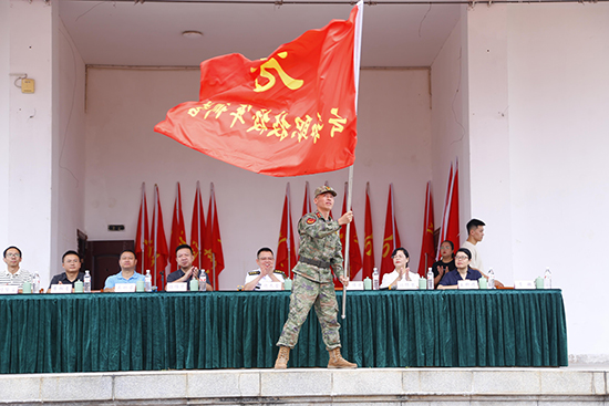 隨后,校黨總支書記陳偉華為軍訓授營旗。李超授連旗。