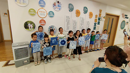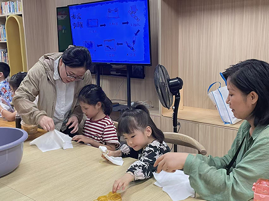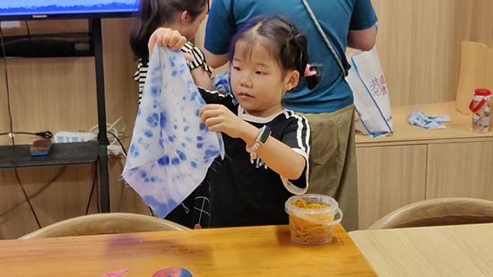 非遺扎染活動同樣精彩。志愿者向青少年介紹扎染的歷史淵源與“捆扎防染”的基本原理,演示折疊、捆扎、染色等關鍵步驟。孩子們躍躍欲試,用皮筋將白布扎出不同花紋,再放入染料中浸泡。當解開皮筋,看到白布上呈現出藍白相間、圖案各異的紋理時,大家紛紛驚嘆于扎染工藝的神奇,也在實踐中體會到傳統手工藝的匠心與智慧。