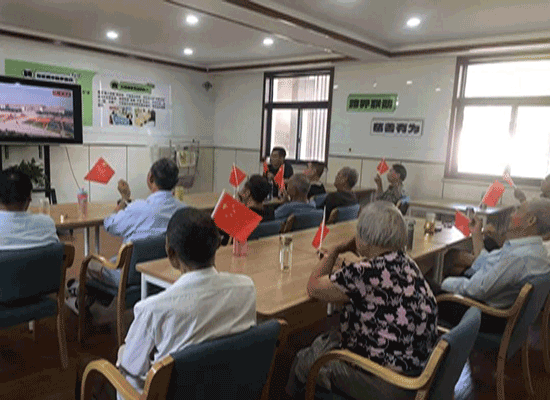 上午9點不到,樂齡教室內已是歡聲笑語,老人們手舞小紅旗,胸貼小五星,眼晴緊瞪著電視屏幕,生怕錯過每一個細節。