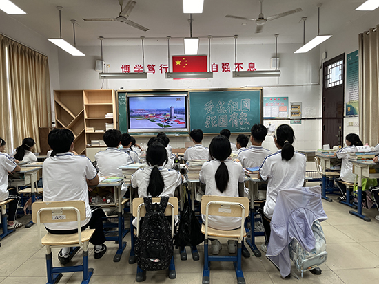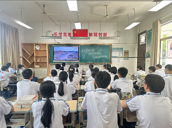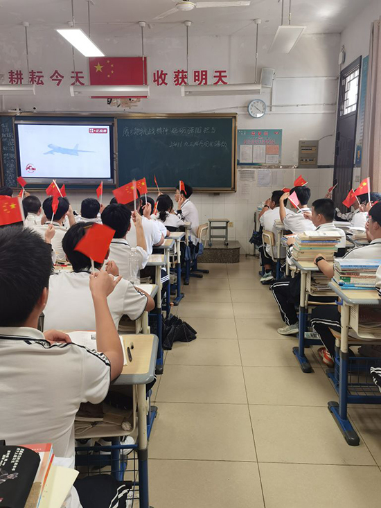 觀禮開始前,班主任們已將“技能筑夢,強國有我”任務單分發到每位學生手中。直播開啟的瞬間,教室里瞬間安靜下來,唯有屏幕中傳來的激昂樂曲與鏗鏘步伐回蕩。部分班級更以沉浸式方式參與其中,跟隨直播旋律齊聲奏唱國歌,嘹亮的歌聲里滿是對祖國的赤誠與敬意。