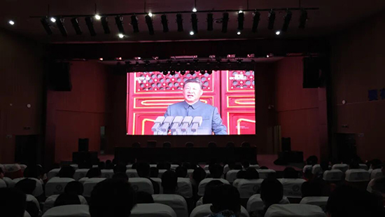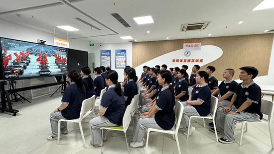 上午9時,閱兵儀式正式開始。學校全體師生在報告廳、教室、辦公室等地,同步觀看直播盛況。觀看現場氣氛莊嚴肅穆,師生們全神貫注,跟隨鏡頭回顧中國人民浴血奮戰的抗戰歷程,感受新時代中國軍隊的威武雄姿。當國旗護衛隊邁著鏗鏘步伐入場,當受閱方陣以整齊劃一的隊列接受檢閱時,場內不時響起熱烈掌聲,師生們為祖國的強大和民族的復興深感自豪。