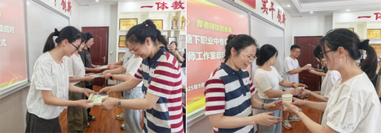 潘鋒副校長宣讀了此次師徒結對的人員名單,隨后為各位師傅頒發結對證書。在與會領導、老師的共同見證下,徒弟們向師傅敬茶,表達了對師傅的尊敬與求教的誠心;師傅們則回贈書籍,寄托了對徒弟的殷切期望。莊嚴而溫馨的儀式不僅明確了師徒雙方的職責與義務,更結下了深厚的師徒情誼。鄭小勇老師表示,“青藍相接”“薪火相傳”“教學相長”是學校發展的寶貴傳統和強大動力。