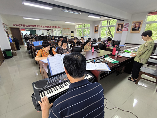 課程設計注重互動性與趣味性。開班儀式上,學員們分組在伴奏下合唱紅歌。教師通過分步教學,幫助零基礎學員快速掌握節奏和音準,并結合紅歌歷史背景講解,深化學員對革命精神的理解。例如,在《彈起我心愛的土琵琶》合唱環節,電子琴的悠揚琴聲與學員們的鏗鏘歌聲交融,營造出感人至深的藝術氛圍。一位72歲的學員感慨道:“通過唱紅歌讓我重溫青春歲月,心里充滿力量!”。