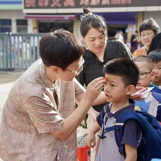 啟智明智:“朱砂啟智”!新生們拉著爸爸媽媽的手走進校園,趙娜、馮利霞、屠琪鋒三位校長等候門口,分別用蘸著朱砂的梅花印章,向每一位新生的眉心點上寓意深遠的“紅痣”。祝愿從此眼明心亮,好讀書、讀好書,知賢明理,在浩瀚的知識海洋中揚帆啟航。新生們好奇地接受額間的“智慧印記”,家長們紛紛用手機錄下這珍貴的瞬間。這一抹朱紅,成為了新生們開啟小學之旅最深刻的印記。