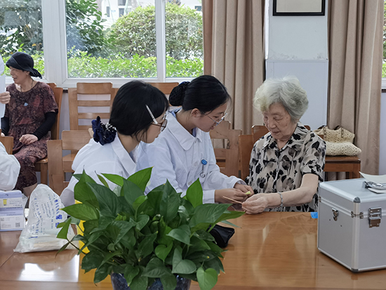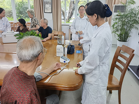 會議室,同學們分工協(xié)作,為退休教師們免費測量血壓、血糖、血氧飽和度,詳細記錄健康數(shù)據(jù),并耐心詢問日常飲食、作息和用藥情況。針對退休教師存在的慢性病問題,同學們在指導老師王萍和羅丹的帶領(lǐng)下,進行了個性化的健康宣教,普及健康知識。