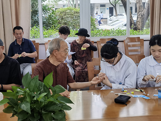 鍛煉技能,服務(wù)老師。教師節(jié)當天,寧波東錢湖旅游學校24護理中高班的同學們發(fā)揮專業(yè)所學,為退休教師們“健康體檢”。