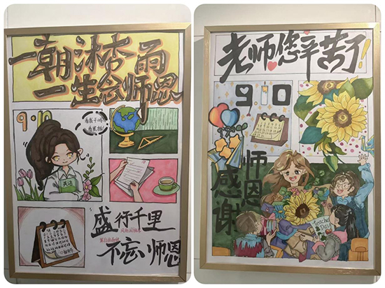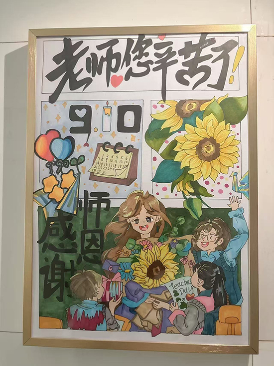師生餐廳樓梯墻面裝飾了由同學(xué)們親手繪制的祝福卡片。一張張卡片色彩鮮明、筆觸真摯,無聲傳遞著莘莘學(xué)子對(duì)老師的深厚情誼。活動(dòng)期間,許多教師駐足細(xì)看,在圖文之間感受來自學(xué)生的真誠祝福。