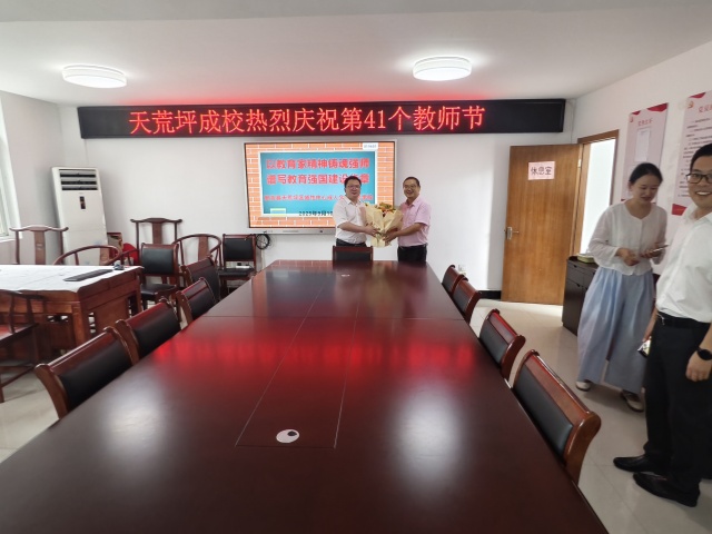 活動現(xiàn)場布置得簡潔而莊重,“天荒坪成校熱烈慶祝第 41 個教師節(jié)” 的電子屏十分醒目,傳遞著對教師的敬意與祝福。鎮(zhèn)領導的到來,讓現(xiàn)場的氛圍更加熱烈。