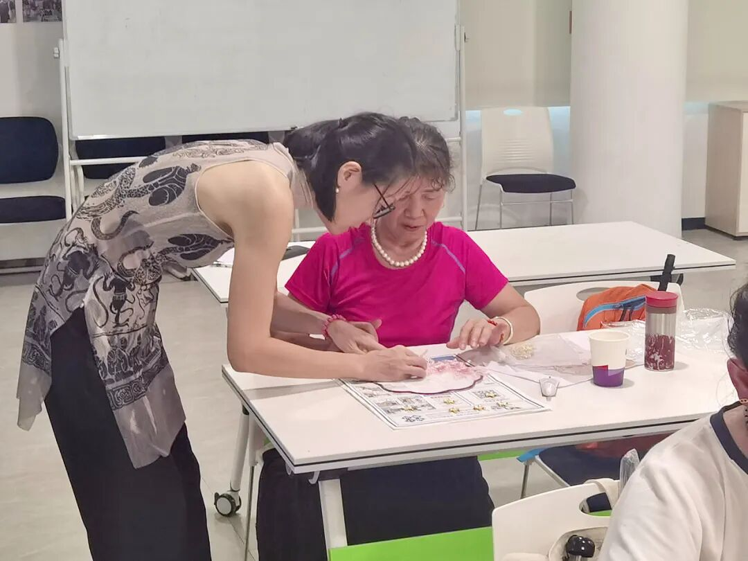 在活動現場,老師細致講解了團扇制作的每個步驟,即便是零基礎的居民也能輕松掌握要領。對于居民們在制作過程中遇到的疑問,老師都一一耐心解答,特別是在膠水使用技巧和材料搭配等環節,提供專業而實用的建議。在老師的悉心指導下,每位參與者都成功制作出了獨具特色的精美團扇。