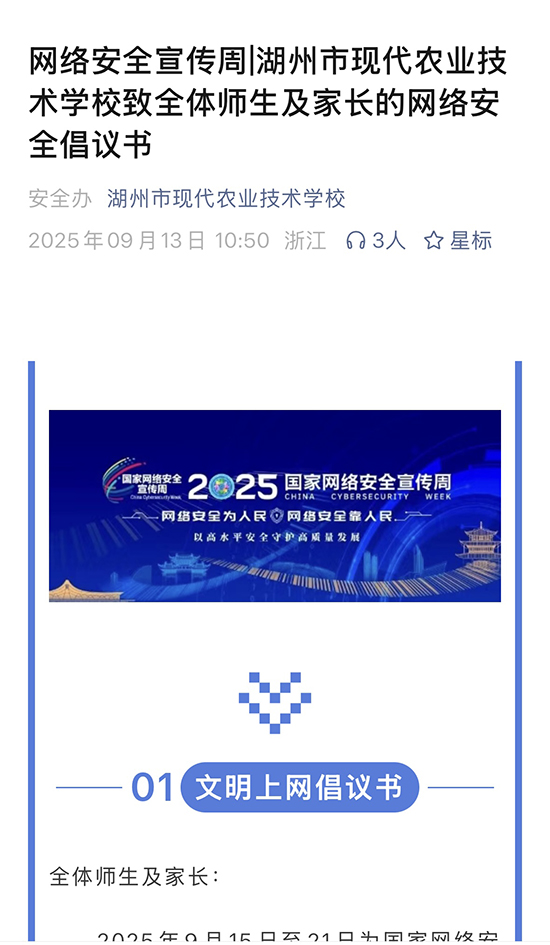 9月15日至9月21日是國家網(wǎng)絡(luò)安全宣傳周。為進(jìn)一步提高全校師生的網(wǎng)絡(luò)安全意識,普及網(wǎng)絡(luò)安全知識和技能,推動校園網(wǎng)絡(luò)安全建設(shè),湖州市現(xiàn)代農(nóng)業(yè)技術(shù)學(xué)校開展了形式多樣的網(wǎng)絡(luò)安全周校園日主題教育活動,為全校師生營造安全、健康、文明、和諧的校園網(wǎng)絡(luò)環(huán)境。