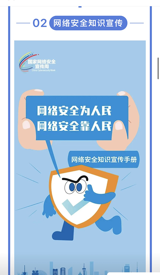 推送一期國家網(wǎng)絡(luò)安全宣傳周專題的微信公眾號,引導(dǎo)帶動師生、家長全面了解網(wǎng)絡(luò)安全知識并積極防范,提高自身網(wǎng)絡(luò)與信息安全意識和識別各類網(wǎng)絡(luò)與電信詐騙方式的能力,從而提高宣傳教育周活動的覆蓋面和實(shí)效性。