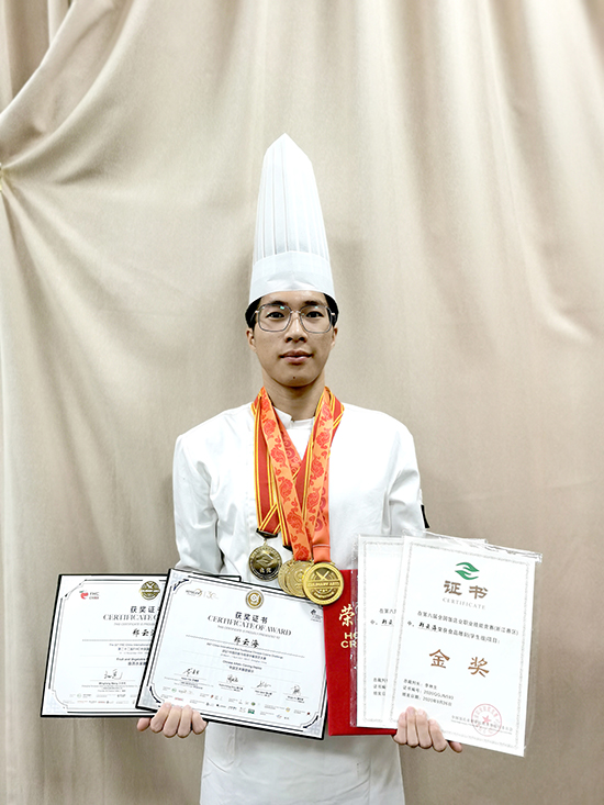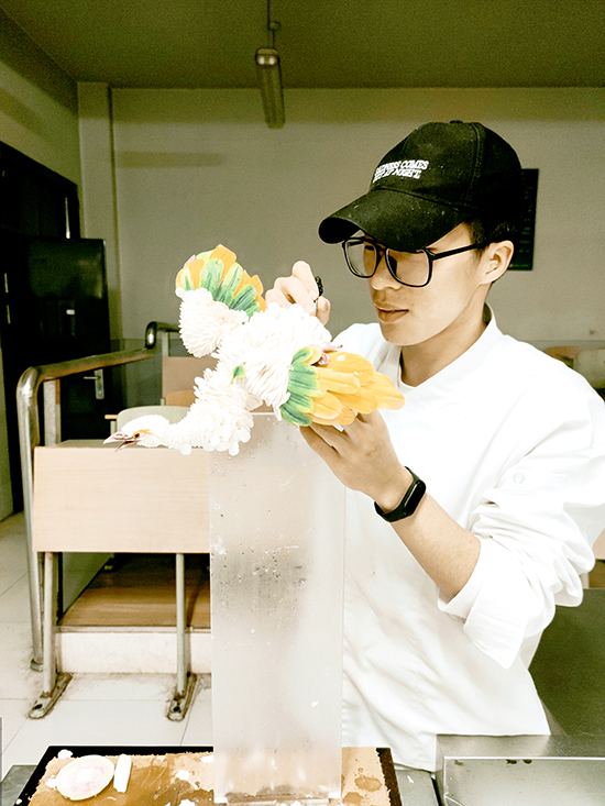 刻苦學藝,蘿卜花喚醒少年夢。初三畢業那年,鄭云海在杭州第一技師學院校園開放日與食品雕刻不期而遇。胡蘿卜雕琢的鳳凰展翅欲翔,“心里美”蘿卜盛開的牡丹儀態萬千,食材經匠人之手幻化成藝術品,少年聽見了夢想破土的聲音。興趣引導,鄭云海拿起雕刻刀,卻發現前路布滿荊棘。雕刻月季,花瓣層次誤差要控制在0.1毫米,花芯弧度更需歷經上百次失敗才能精準把握。殘損的蘿卜花填滿宿舍垃圾桶,創可貼成為手指第二張皮膚,他不知疲倦在深夜臺燈下反復鉆研。恩師李小明發掘了鄭云海的潛力,開啟了對他的嚴苛訓練。別人在周末休閑放松,鄭云海在零下5℃的操作間一雕就是八個小時,手指被凍得通紅;春節闔家團圓時,他守在工作室,對照《芥子園畫譜》鉆研,把《牡丹亭》的詩意融入冷盤。2022年“第十屆國際殘疾人職業技能大賽國內選拔賽”,他憑借《荷塘月色》奪冠。48種食材、1314片花瓣,藏著“一生一世”的浪漫匠心,這是對傳統美學的致敬。