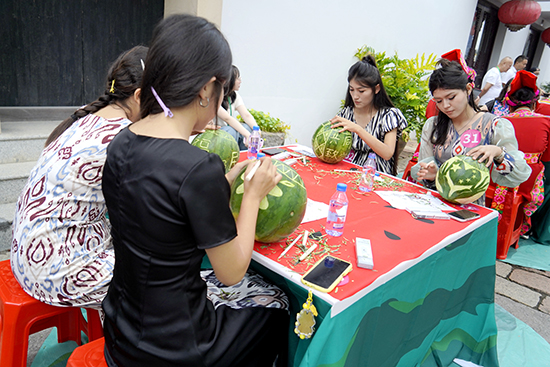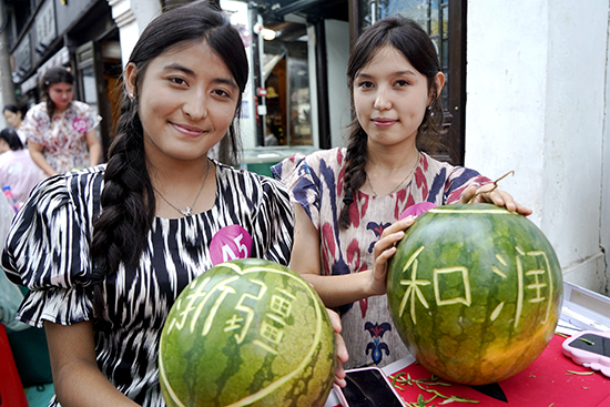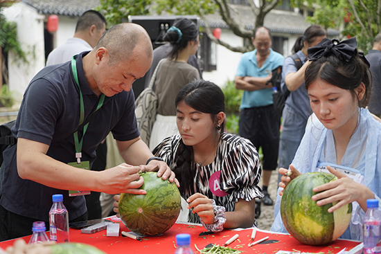 身著維吾爾族傳統服飾的學子們,很快成了街區里最先“點亮”視線的風景:他們全情投入雕刻,指尖的刻刀在翠綠瓜皮上靈活游走:時而輕劃勾勒江南紋樣的柔婉線條,時而凝神精雕細節處的精巧弧度,吸引了大批游客駐足。