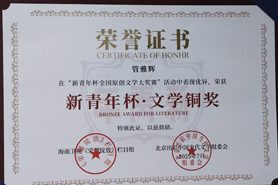 文章完成后,班主任李安興老師鼓勵我大膽嘗試投稿。在他的幫助下,我懷著忐忑又期待的心情,將文章投給了海南衛(wèi)視《榮耀綻放》欄目組,以及由北京出彩中國當(dāng)代文學(xué)組委會主辦的“新青年杯全國原創(chuàng)文學(xué)大獎賽”。從初審、大眾投票到終審,每一步我都格外關(guān)注,而最終的結(jié)果,遠遠超出了我的預(yù)期——經(jīng)過專家評審團的最終評定,我的文章有幸獲得了本次大賽的“文學(xué)銅獎”。得知獲獎的那一刻,內(nèi)心的激動與喜悅幾乎無法用語言形容:這不僅是對我個人努力的肯定,更是對我所熱愛的計算機專業(yè)、對日新月異的AI技術(shù)的認(rèn)可。