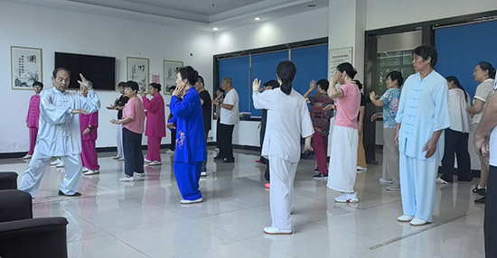 孫老師還引導學員領悟太極拳的精神境界,要求心無雜念、全神貫注,將意念融入動作,做到眼隨手走、神注于拳,仿佛與天地萬物融為一體。播放古典音樂后,學員們閉眼靜心感受呼吸與身體變化,再隨音樂節奏練習,動作愈發柔和流暢,眼神透著寧靜專注。