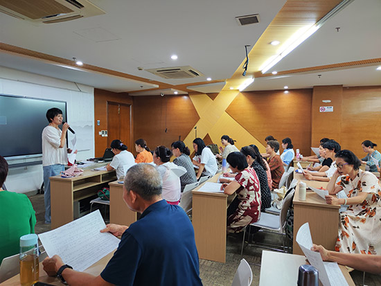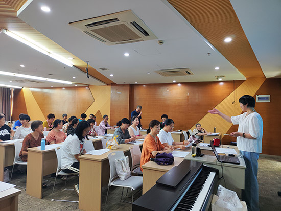 課程伊始,吳老師先讓學員們進行自我介紹、互相認識,有基礎的學員還哼上幾句越劇,讓老師把把關看看基礎,也惹得學員們開懷大笑,大家在歡聲笑語中破冰。本次課吳老師教的是《何文秀—心連心選段》,吳老師從基礎唱腔入手,逐字逐句指導學員把握音準與節奏,同時示范經典身段動作,如蘭花指、臺步等,耐心糾正細節姿勢。學員們神情專注,手持曲譜認真跟練,時而輕聲哼唱,時而模仿身段,遇到疑問及時向老師請教,互動氛圍熱烈。