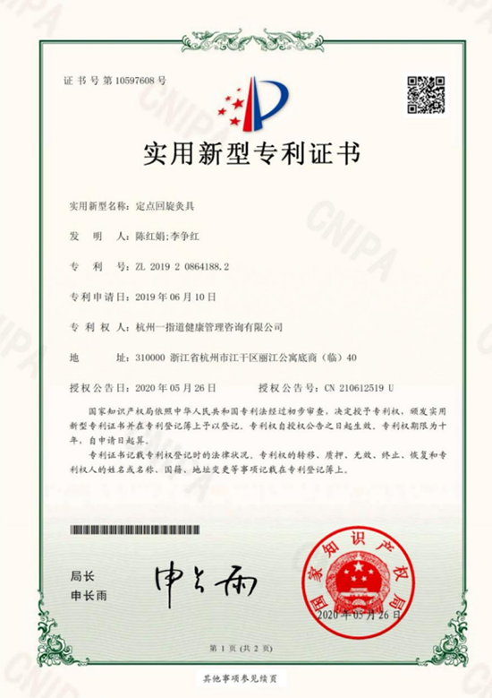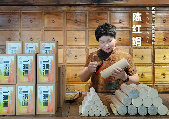 她勤修內功,加快推進古法艾灸的創新發展,有意識地進行傳統醫藥知識產權的保護。筧橋古法艾灸項目以祖傳艾條配方、百字銘文、扶陽固本“四部灸法”和特色專用灸具為主要特色其中秘制大艾條是核心技藝的重要載體,成為筧橋古法艾灸的立足之本。陳紅娟懷著“抱元守一的思想(“元”指古法艾灸,“一”則是仁愛之道),經過多年的專業學習,為大眾的養生之道研究新的路徑,目前已全面掌握 5 根大艾條的配方、古法制作技藝和辨證施治要領,并在祖傳扶陽固本“四部灸法”的基礎上,針對人體不同部位的經絡走勢,不斷拓展灸法的實踐。現研發推出的主要產品有:扶陽大艾條、至尊灸條、寶寶艾、防疫細艾、貴妃灸條等,并已成功申報注冊商標“筧橋古法”“一指道”“杭十八”“南宋御艾”和“宋韻江南”;針對艾灸操作費力費時、過量艾煙污染環境關鍵技術設備落后等問題,進行針對性的技術攻關成功研制并申請實用新型專利“定點回旋灸”和外觀設計專利“艾灸儀”;拓展衍生產品艾草膏、艾草浴包、艾尖茶、艾草暖貼、艾草枕、艾草香品等若干。考慮“五根大艾條”之一的“扶陽灸”(又名“扶陽固本灸”)已面世10年,各項技術要領和實操經驗均已成熟,她擴大研發團隊,建全禪城保護檔案,保護祖傳配方,重啟剩余四根大艾條“駐世灸”“調神灸”“痿蹙灸”“通體灸”的復活工作。