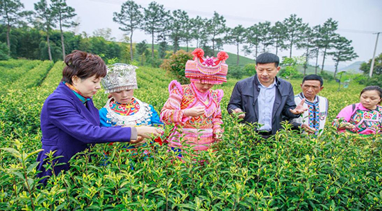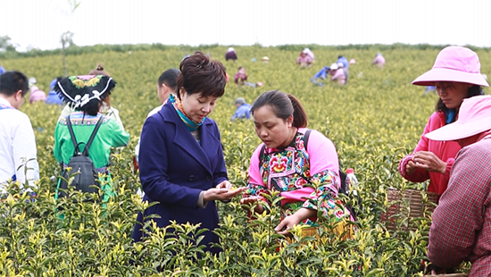 “我們能富起來,是黨和政府幫扶的結果。替國家分憂,是我們的責任。”富起來的宋昌美,念念不忘黨和政府的恩德。2018年4月,溪龍鄉黃杜村書記倡議大家給習總書記寫信,匯報村里種植白茶致富情況,并提出捐贈1500萬株“白葉一號”茶苗幫助西部貧困地區群眾脫貧,她第一個舉手贊成,立馬認領捐贈“白葉一號”扶貧苗80萬株。為解決茶苗“往哪兒種”的問題,她與國務院扶貧辦一道先后四次赴云貴川湘等地區考察選址,七天內坐了5趟飛機,4趟動車,近50個小時汽車。她承諾要種活、種好、種出成效。這些年里,宋昌美共往返三省五縣“白葉一號”種植基地近20趟,手把手教農戶基地管理、茶葉采摘、炒制加工、市場銷售等全過程技術經驗。在像她這樣“土專家”的不懈幫扶下,受捐地已推廣種植“白葉一號”茶園5萬余畝,茶苗存活率接近90%,2022年三省五縣受捐各村共計采摘青葉6.5萬余斤,銷售收入770萬元,成功帶動2064戶貧困群眾脫貧增收。