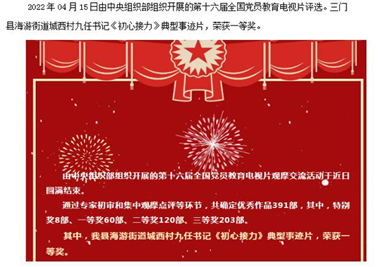 由中央組織部組織開展的第十六屆全國(guó)黨員教育電視片觀摩交流活動(dòng),講述三門縣海游街道城西村九任書記故事的《初心接力》榮獲全國(guó)黨員教育電視片一等獎(jiǎng)。海游街道城西村自1957年建立村黨支部以來(lái),九任黨組織書記不忘初心,一任接著一任干,把黨的組織優(yōu)勢(shì)轉(zhuǎn)化為鄉(xiāng)村治理效能,城西村從“一窮二白”向“村強(qiáng)民富”華麗蛻變,成功打造了新時(shí)代黨建引領(lǐng)鄉(xiāng)村振興范本。曾經(jīng)吃穿都發(fā)愁、需要翻身的“翻身村”,成為“浙江省小康示范村”,集體經(jīng)濟(jì)年收入上千萬(wàn)元,年人均收入8萬(wàn)多元。2021年建黨100周年,城西村黨委獲評(píng)“全國(guó)先進(jìn)基層黨組織”。第九任書記章國(guó)進(jìn)代表村黨委進(jìn)京領(lǐng)獎(jiǎng),受到習(xí)近平總書記等黨和國(guó)家領(lǐng)導(dǎo)同志的親切會(huì)見(jiàn)并合影留念。