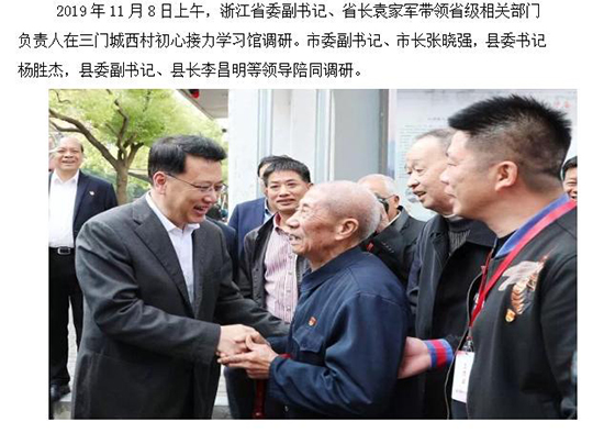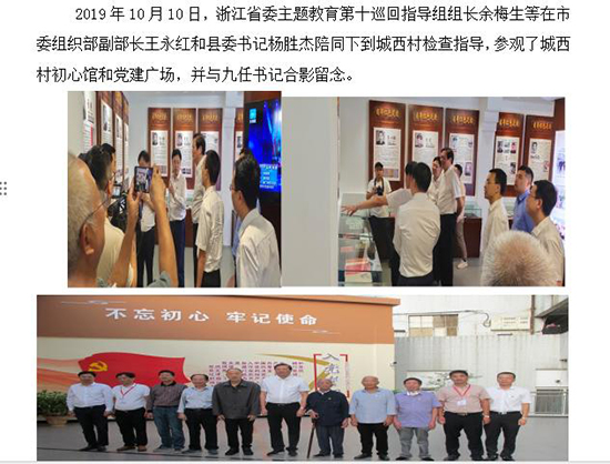 《“初心接力”學(xué)習(xí)館》被定為浙江省、臺(tái)州市、三門縣三級(jí)愛(ài)國(guó)主義教育基地,以及臺(tái)州市“跟著紅色地圖學(xué)黨史”現(xiàn)場(chǎng)學(xué)習(xí)教育基地、臺(tái)州市初心使命教育基地。隨著深入學(xué)習(xí)貫徹習(xí)近平新時(shí)代中國(guó)特色社會(huì)主義思想走入走新,各級(jí)單位組織黨員、群眾前來(lái)調(diào)研考察、參觀指導(dǎo)。自建館來(lái)共接待前來(lái)省市縣各級(jí)考察團(tuán)共120批次3500人。開展“初心接力”紅色足跡體驗(yàn)學(xué)習(xí)活動(dòng)。2019.11.8,時(shí)任浙江省委副書記、省長(zhǎng)袁家軍帶領(lǐng)省級(jí)相關(guān)部門負(fù)責(zé)人來(lái)三門城西村初心館開展調(diào)研活動(dòng)。2023.12.27,時(shí)任省委書記易煉紅等領(lǐng)導(dǎo)來(lái)城西村初心館,考察了解農(nóng)村黨組織開展主題教育和黨建引領(lǐng)鄉(xiāng)村振興等情況。2019年10月10日,時(shí)任省委主題教育第十巡回指導(dǎo)組組長(zhǎng)余梅生等領(lǐng)導(dǎo)到城西村初心館和黨建廣場(chǎng)體驗(yàn)學(xué)習(xí),并與九任書記合影留念。