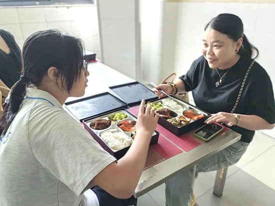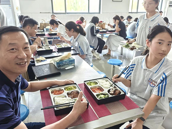 會后,家長們走進食堂,和孩子們共進午餐。他們圍坐在一起,聊聊學習生活、嘗嘗食堂美味,現場氛圍溫馨而快樂。