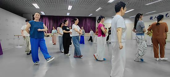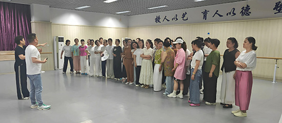 簡短而莊重的開班儀式結束后,兩位老師便馬不停蹄地投入到了緊張而有序的教學中。她們首先帶領學員進行熱身走步,過程中,兩位老師耐心細致,不放過任何一個細節,親自示范步法與手勢,讓學員們能夠準確掌握每一個動作要領。隨后,根據學員的特點和自身優勢,將學員們巧妙地分為花旦和小生組,進行有針對性的教學。在兩位老師的悉心指導下,學員們迅速進入狀態,全神貫注地認真練習,現場學習氛圍濃厚。不一會兒,學員們便轉入了越劇經典劇目《打金枝·闖宮》的排練中。大家各展風采,將越劇的韻味展現得淋漓盡致,現場氣氛熱烈而有序,仿佛一場精彩的越劇盛宴正在徐徐拉開帷幕。