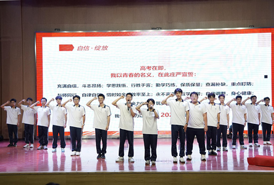 以同心筑力量,以祝福伴前行。“我以青春的名義宣誓:不負(fù)父母期盼,不負(fù)老師厚望……”各班領(lǐng)誓同學(xué)帶領(lǐng)全體高三學(xué)子起立舉拳,錚錚誓言回蕩在會堂,彰顯著高三學(xué)子備戰(zhàn)高考的堅定決心。隨后,身著紅衣的高三任課教師團隊登臺宣誓,承諾“殫精竭慮、陪伴護航”,師生同心的畫面令人動容。