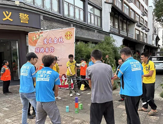 趣味游戲藏歡笑:玩著學(xué)安全,默契滿現(xiàn)場(chǎng)。安全課一結(jié)束,趣味游戲區(qū)變成了歡樂(lè)的海洋。紅楓義警早已備好旱地冰壺、“一錘定音”、同心搭高塔、安全飛行棋四大項(xiàng)目。“來(lái),咱們組隊(duì)!”義警周偉國(guó)拉著幾位外賣小哥直奔旱地冰壺區(qū)。4人一組的比賽里,有人用力過(guò)猛讓冰壺“跑偏”,引得全場(chǎng)哄笑;有人穩(wěn)扎穩(wěn)打?qū)⒈鶋鼗浇K點(diǎn),隊(duì)友們的歡呼聲響徹現(xiàn)場(chǎng)。“一錘定音”區(qū)更熱鬧,環(huán)衛(wèi)工人阿姨兩人一組,揮著小錘瞄準(zhǔn)木墩,“砰砰”聲中,木墩一個(gè)個(gè)被擊落,阿姨們樂(lè)得像孩子般拍手,義警們趕緊遞上紙巾:“阿姨您真厲害!”最讓人揪心又開心的是“同心搭高塔”。10人一組的隊(duì)伍里,外賣員、環(huán)衛(wèi)工人、紅楓義警并肩作戰(zhàn),有人遞積木、有人扶塔身,“慢點(diǎn),左邊歪了”“再加一層,穩(wěn)住!”的提醒聲此起彼伏。當(dāng)高高的“積木塔”穩(wěn)穩(wěn)立在桌上時(shí),所有人都露出了成就感滿滿的笑容,這一刻,陌生的彼此早已默契十足。安全飛行棋旁,4人輪流擲骰子——走到“不闖紅燈”前進(jìn)三步,踩到“逆行危險(xiǎn)”后退兩步。“原來(lái)下棋也能學(xué)安全知識(shí)!”一位外賣小哥笑著說(shuō)。義警隊(duì)長(zhǎng)陳曉芳在旁補(bǔ)充:“可不是嘛!平時(shí)在路上,每一步都得像走棋一樣心里有數(shù)。”