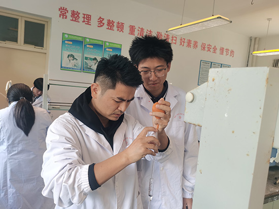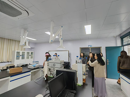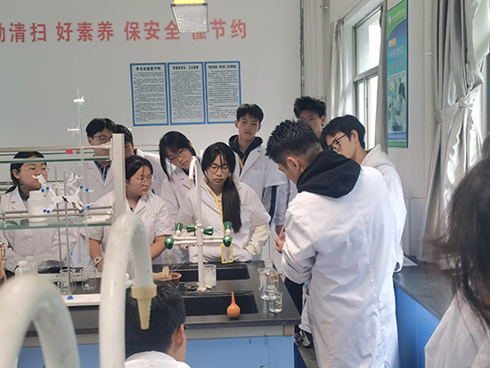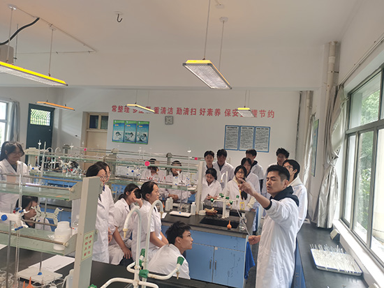 一行人首先走進高三分析化學實驗課堂。課堂上,金曉董老師講解深入淺出,示范規范認真;學生們仔細觀察、熟記于心,嚴格遵守實驗要求,按流程規范操作。整個課堂井然有序,師生互動良好,充分體現了“做中學、學中做”的教學理念。