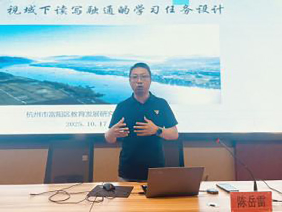 富陽(yáng)區(qū)教育發(fā)展研究中心陳岳雷老師帶來(lái)《單元視域下讀寫(xiě)融通的學(xué)習(xí)任務(wù)設(shè)計(jì)》講座。他深入解析“單元”“讀寫(xiě)融通”與“學(xué)習(xí)任務(wù)”等核心概念,直面寫(xiě)作教學(xué)現(xiàn)實(shí)困境,結(jié)合課例闡釋讀寫(xiě)結(jié)合的有效路徑,鼓勵(lì)教師引導(dǎo)學(xué)生觀察生活、深度閱讀,激發(fā)表達(dá)與創(chuàng)作熱情。