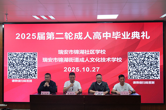 本次畢業典禮不僅是對學員們勤奮學習的肯定,更是對他們未來投身鄉瑞安市錦湖社區學校成功舉辦2025年第二批成人高中畢業典禮。(張再益)