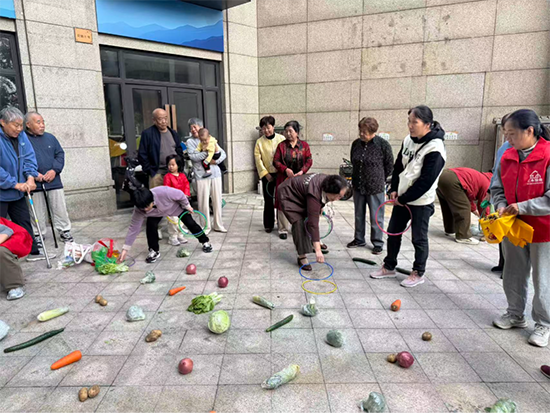社區工作人員早早布置好活動現場,將西蘭花、包心菜、土豆、胡蘿卜、小白菜、玉米等整齊擺放,各式新鮮果蔬代替了傳統的玩具獎品,顯得格外接地氣且充滿生活氣息。