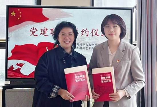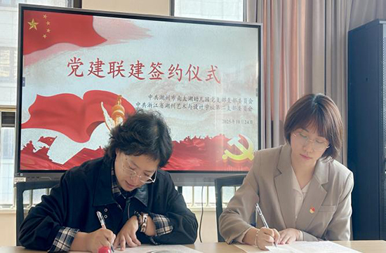 活動伊始,浙江省湖州藝術與設計學校第二黨支部書記李璟與湖州市南太湖幼兒園黨支部書記、園長孫俟萁分別介紹了各自支部的黨建工作特色、師資力量與育人方向,正式簽署《黨建聯建合作協議》。學校授權南太湖幼兒園將《綠青山小調組歌》作為在地研究教學資源。