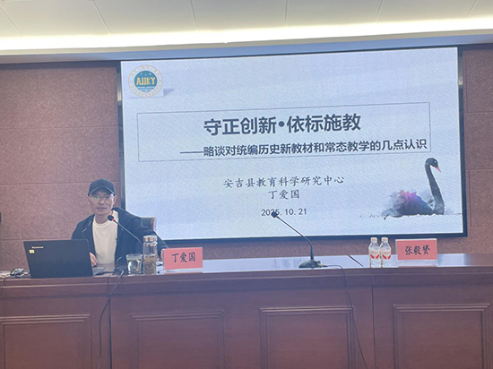 安吉縣初中社會法治教研員丁愛國老師以《守正創(chuàng)新,依標(biāo)執(zhí)教——略談對統(tǒng)編歷史新教材和常態(tài)教學(xué)的幾點認識》為題作講座,丁老師圍繞三大要點展開闡述:首先,介紹八上歷史新教材修訂的總體變化概況——專題史融入通史、課次精簡合并以及各單元內(nèi)容具體修訂;其次,他強調(diào)教師需要關(guān)注近代史中相應(yīng)的宏觀認識和重點問題,幫助學(xué)生樹立正確的唯物史觀;最后,丁老師指出教師應(yīng)依標(biāo)執(zhí)教,注重歷史四大聯(lián)系,著重培養(yǎng)學(xué)生學(xué)科思維。