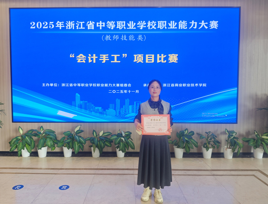 在2025年11月1日至2日舉辦的“2025年浙江省中等職業學校職業能力大賽(教師技能類)會計手工項目”中,蒼南縣職業中等專業學校鄭燕子老師憑借扎實的專業功底和出色的現場表現,在激烈競爭中脫穎而出,榮獲省級一等獎。