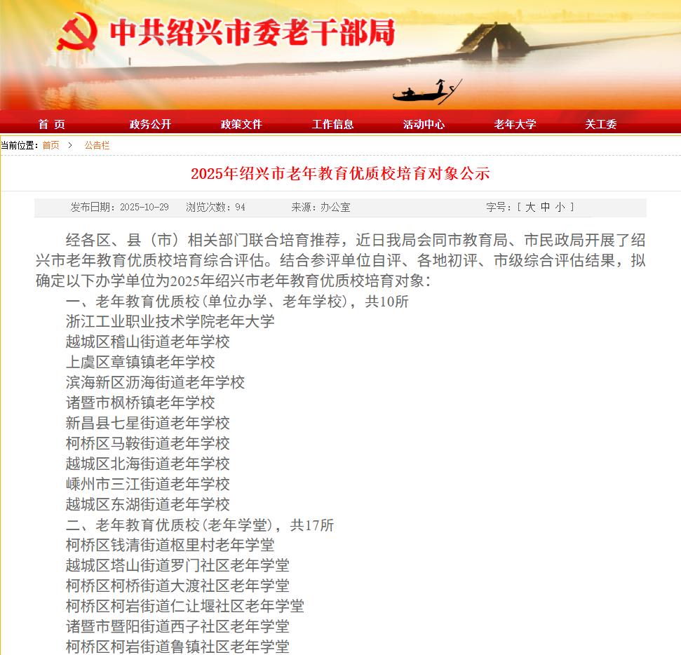 10月29日,樞里村老年學(xué)堂被中共紹興市委老干部局評(píng)為紹興市優(yōu)質(zhì)老年學(xué)堂,也是錢(qián)清街道唯一的一所。據(jù)悉,這次評(píng)上紹興市優(yōu)質(zhì)老年學(xué)堂的全市總共只有17所,要求高,難度大。樞里村老年學(xué)堂能被評(píng)上,這是對(duì)樞里村老年學(xué)堂工作的高度肯定,也使錢(qián)清街道老年教育工作又邁上了一個(gè)新的臺(tái)階。
