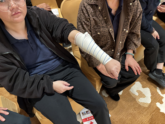 考慮到酒店崗位特性,培訓特別加入場景化演練環節。針對工程部員工日常作業可能面臨的器械劃傷、磕碰等情況,以及前廳部員工接待賓客時可能遇到的客人意外跌倒、擦傷等突發場景,丁柏偉老師現場模擬真實情境,指導員工如何規范操作救護流程,確保在緊急時刻能“懂急救、會操作、敢處置”,將理論知識轉化為實戰能力。
