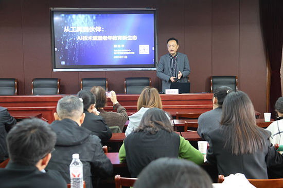 隨后,海鹽縣教育研究中心研訓(xùn)員、浙江省講師團(tuán)講師郭建平作《從工具到伙伴:AI技術(shù)重塑老年教育新生態(tài)》報告。他面對數(shù)字時代可能形成的“信息繭房”,AI技術(shù)成為關(guān)鍵破局點(diǎn)——它既能根據(jù)老年人的興趣精準(zhǔn)推送書畫、養(yǎng)生等課程,又能主動引入跨領(lǐng)域內(nèi)容,打破認(rèn)知壁壘,人工智能正從輔助工具升級為老年教育的貼心伙伴,通過個性化學(xué)習(xí)路徑與情感化交互,重塑著老年教育新生態(tài)。