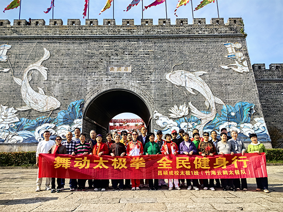 活動(dòng)第一站,學(xué)員們來到了昌國衛(wèi)古城。古城門墻繪著靈動(dòng)的錦鯉與蓮花,古風(fēng)建筑與文化元素交融,盡顯歷史韻味。學(xué)員們?cè)诠懦情T前再次集結(jié),鮮艷的“舞動(dòng)太極拳 全民健身行”橫幅與古樸的城門形成鮮明對(duì)比,既展現(xiàn)了太極文化的傳統(tǒng)底蘊(yùn),又彰顯了當(dāng)代中老年人積極向上的生活態(tài)度。