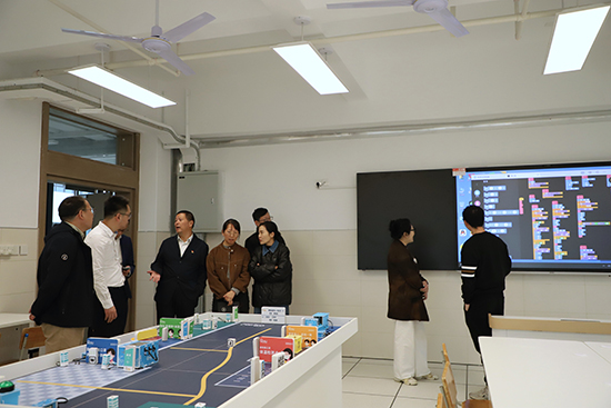 在鄞州職高校長張武劍的陪同下,高校與企業代表一同參觀了學校的數字綜合實訓室、百度AI綜合實訓室、數智職業體驗中心、數智星工場、AI科創實訓室等現代化教學實踐場所。參觀過程中,各方代表對學校先進的設施設備、豐富的教學場景以及濃厚的數智化育人氛圍給予了高度評價。